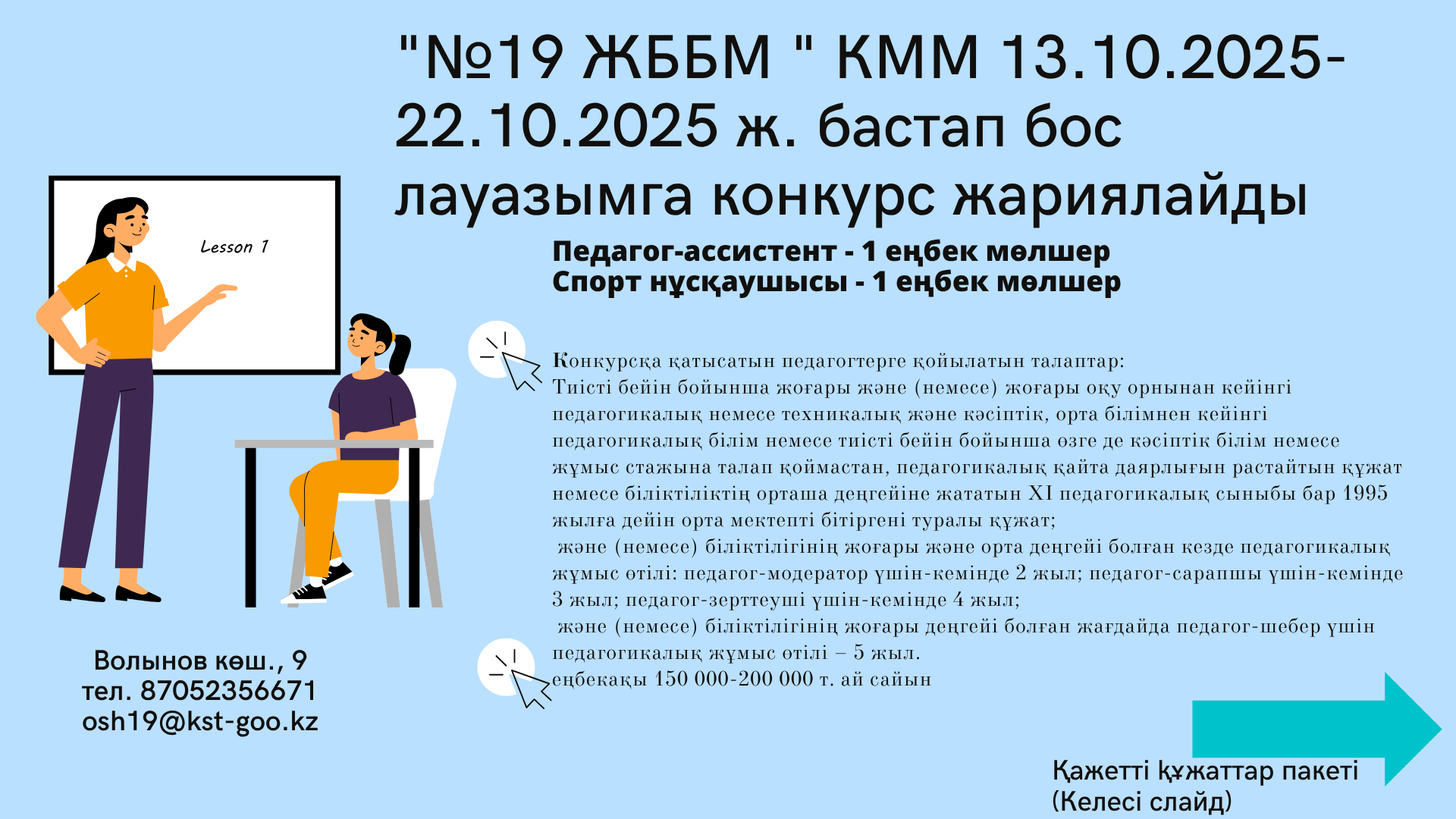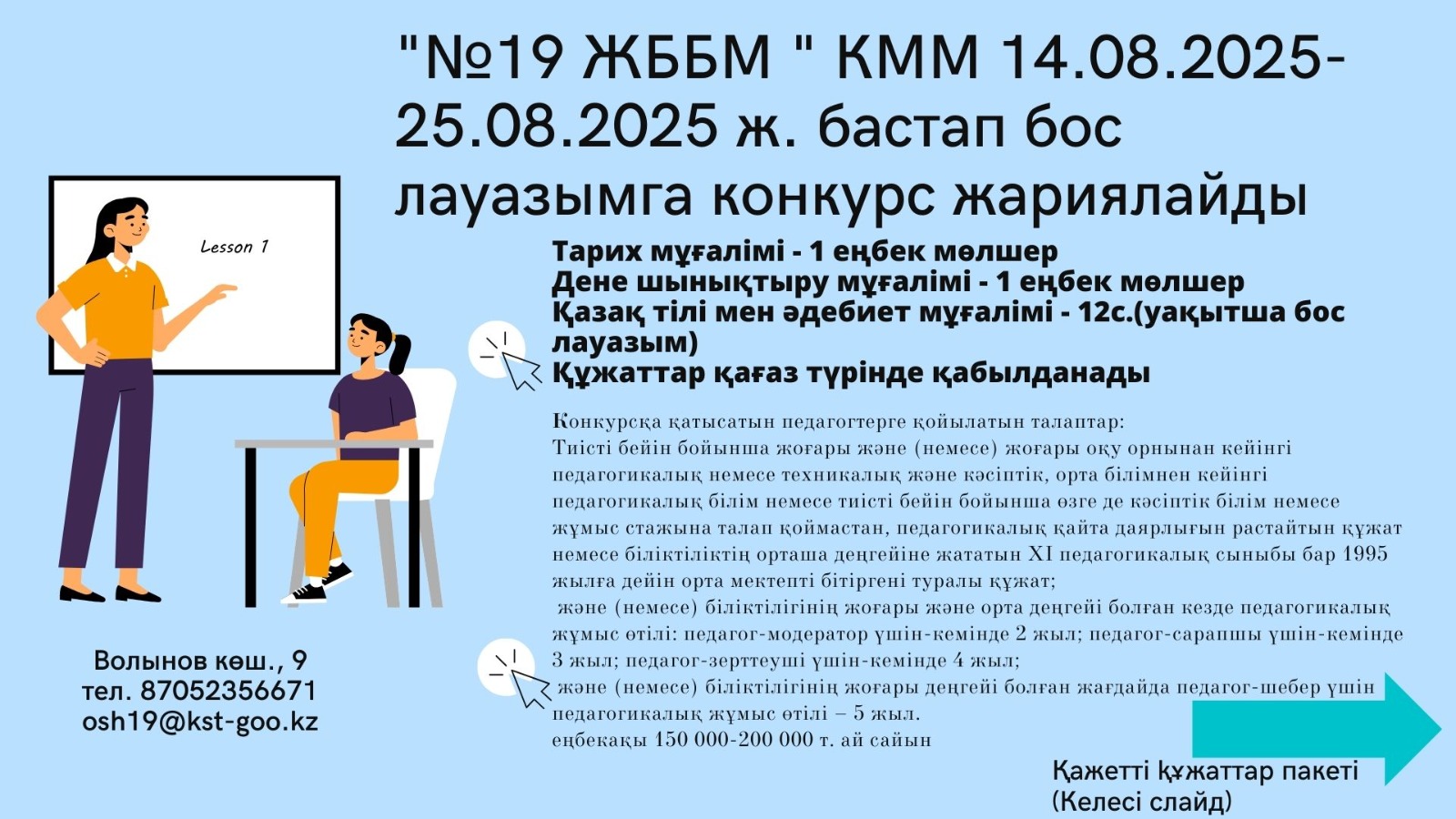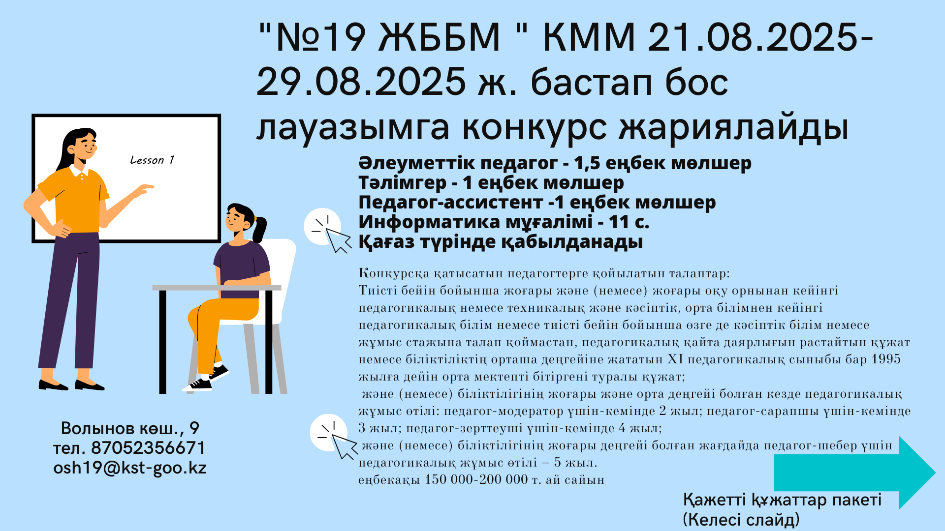Бос жұмыс орыны — "Қостанай қаласы білім бөлімінің № 19 жалпы білім беретін мектебі" КММ